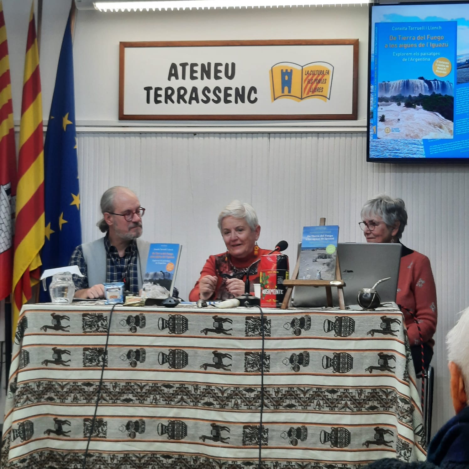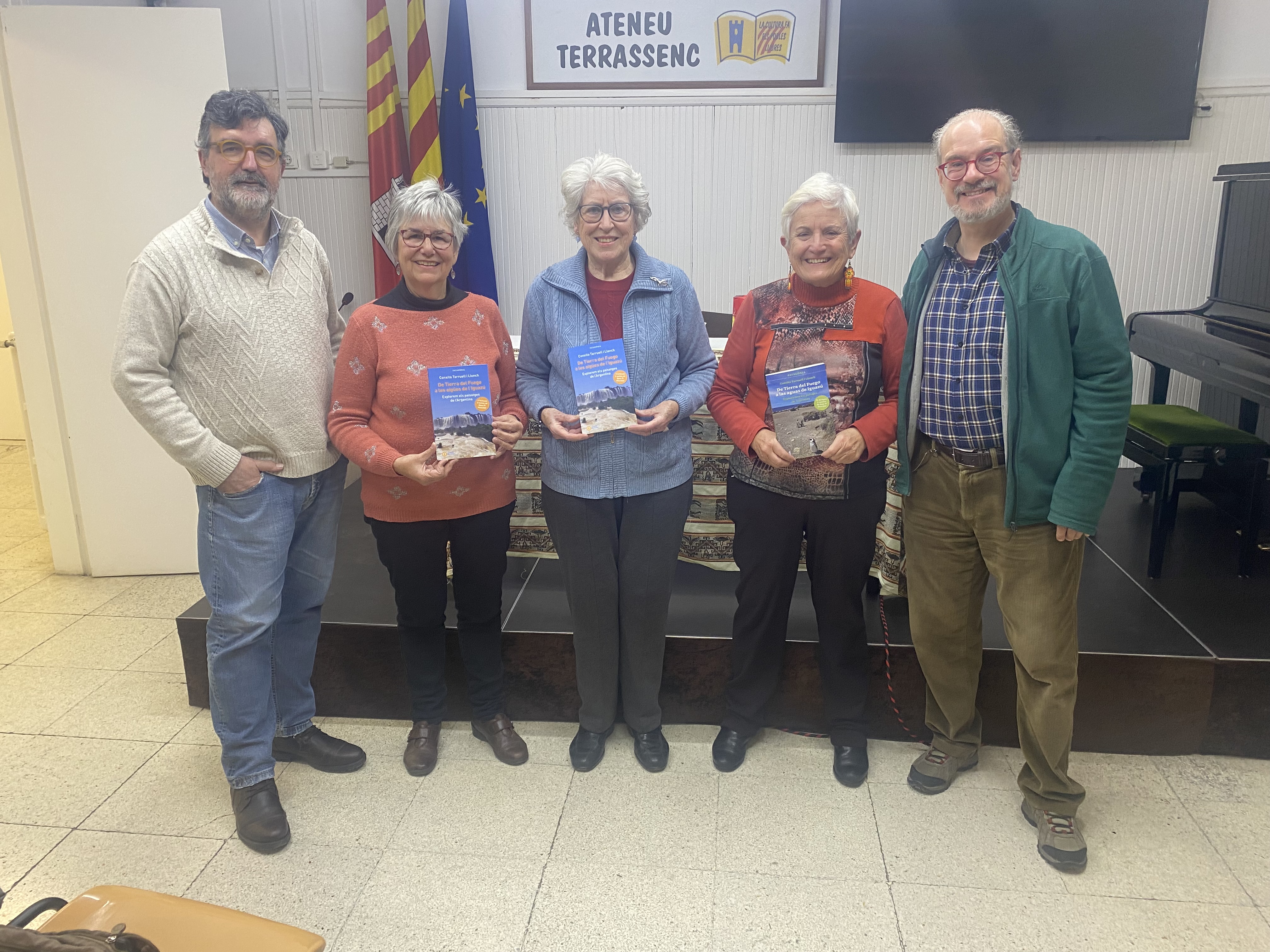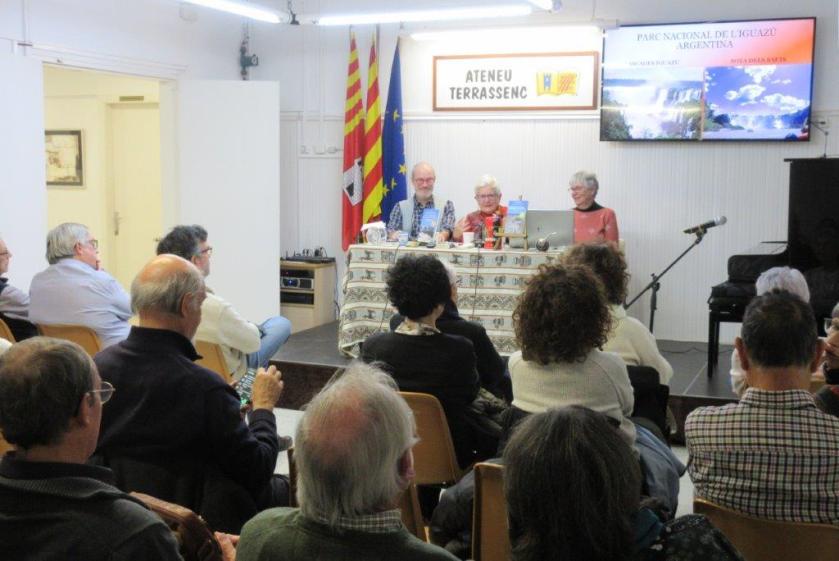 El dijous 16 de gener, l’Ateneu Terrassenc s’ha omplert d’energia i curiositat per la presentació del llibre De Tierra del Fuego a les aigües de l’Iguazú, publicat per Tushita Edicions. de Conxita Tarruell i Llonch amb dos contes de Rosa Pi Masvidal. L’acte ha començat amb la càlida benvinguda de Jordi Torres, membre de la Junta Directiva de l’entitat, que ha destacat la rellevància de l’esdeveniment. A continuació, Enric Soler Raspall, editor del llibre, ha pres la paraula per presentar les autores i detallar el procés de creació d’aquesta obra tan especial. Les protagonistes, Conxita i Rosa, han captivat l’audiència amb el relat de les seves vivències durant el viatge, enriquint les seves paraules amb fotografies que transportaven els assistents a la Patagònia i les espectaculars cascades de l’Iguazú.L’Aurelia Llach ha captivat els assistents llegint fragments de contes que han fet volar la imaginació dels presents: des de la bulliciosa colònia de pingüins de la Península Valdés, on el so de les ones es barreja amb el xivarri dels ocells marins fins a les inquietants aigües del llac Nahuel Huapi, on l’enigmàtica presència del monstre Nahuelito ha fet intrigar als públic amb un toc de terror i fascinació. L’esdeveniment ha comptat amb una gran assistència de públic, que ha mostrat interès pel llibre i les experiències narrades, també ha participat amb preguntes i han compartit impressions en un ambient agradable.