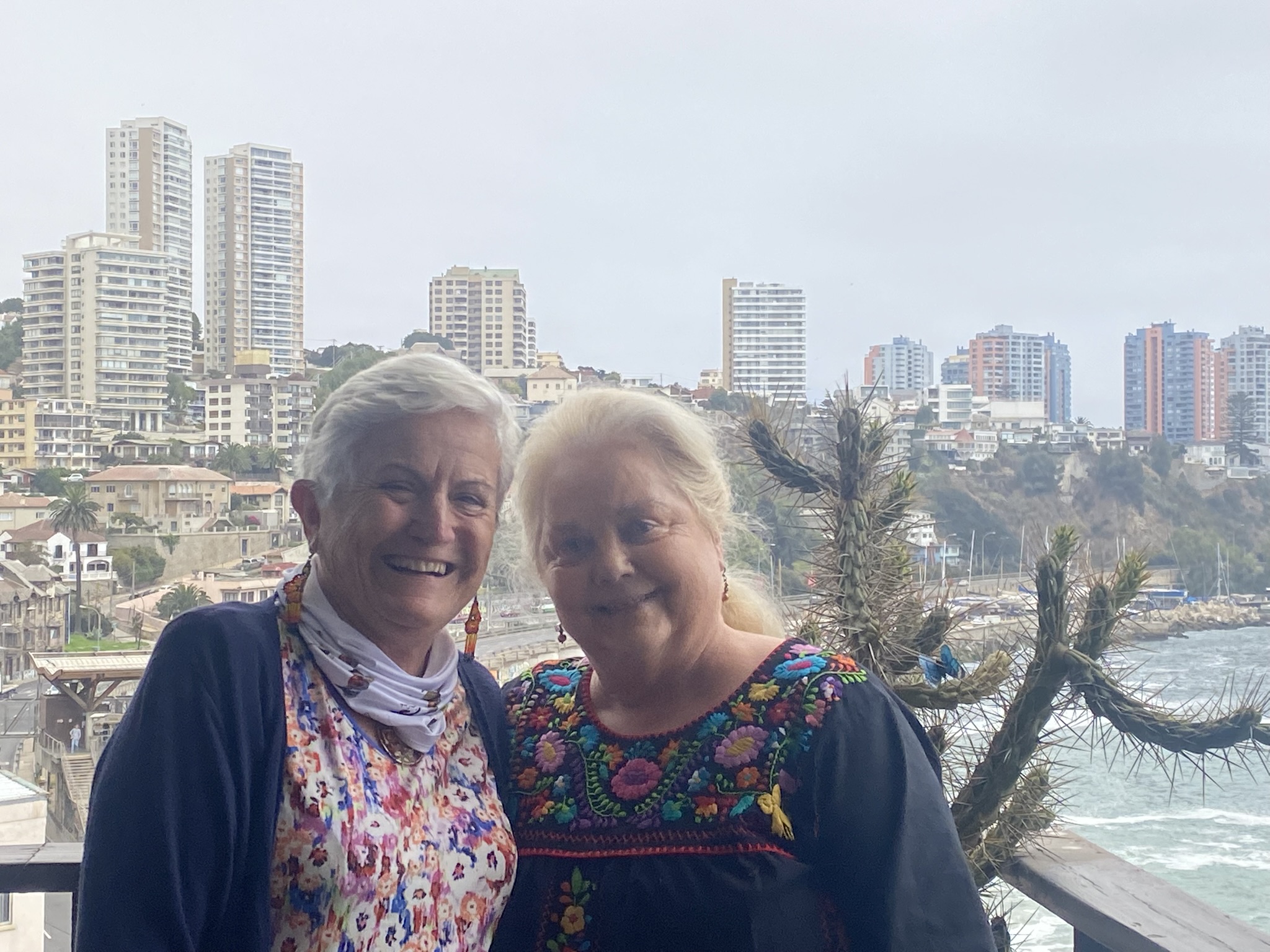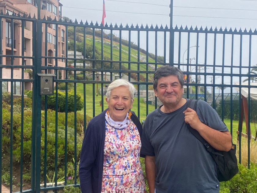 Somos acogidas en su casa de Viña del Mar, con vistas al mar que inspiran calma, donde Emilia, la cocinera, nos sirve tostadas con salmón, queso y aceitunas bañadas en pisco sour, mientras Kamel, profesor emérito de la Pontificia Universidad Católica de Valparaíso, y Luz María, profesora de francés jubilada, comparten con cariño su historia familiar: dos hijos, uno médico y el otro gerente de uno de los supermercados de la cadena Jumbo. La sorpresa de una llamada de Assumpta de Sabadell enriquece la jornada con una entrañable conversación transatlántica, recordando viejos lazos de amistad. Por último, disfrutamos de una ensalada con camarones, un pastel de choclo y una mousse de lúcuma, que nos deja un recuerdo dulce e inolvidable.