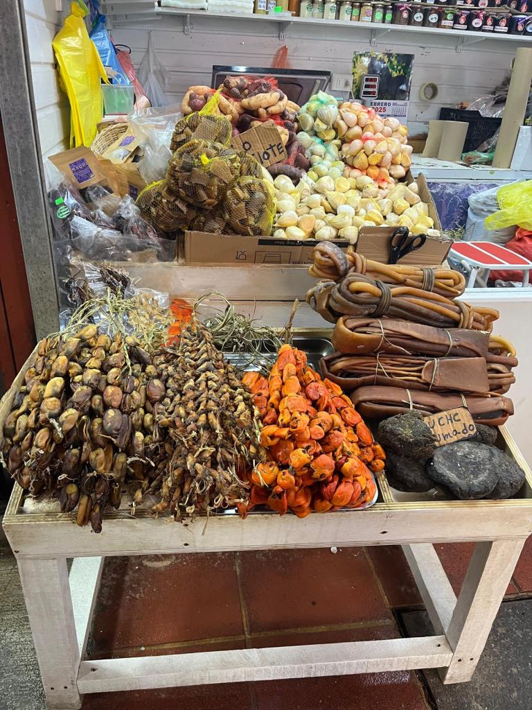 El mercado de Angelmó, que me deja fascinada ante una parada donde todo es nuevo para mí. Blanca me explica que en la primera mesa de izquierda a derecha están los choros maltones, en medio están las navajas y los de color naranja son los piures, todos secos sin las conchas. Al lado, unos bultos grises que son un alga seca llamada luche, y los bultos marrones son otra alga, el cochayuyo. Más atrás, en la otra mesa, hay unos ajos muy grandes, que solo se ven en Chiloé, llamados ajo chilote. El cochayuyo cortado y embalado, listo para vender y las papas chilotes, tanto de variedad blanca como oscura, completan la parada. También hay bolsitas de ají cacho de cabra, muy picante, y de un fruto chileno llamado maqui, utilizado como remedio para la diarrea. Todo un mundo de sabores y tradiciones que me sorprende y me conecta con la esencia de Chile, donde cada detalle me hace sentir más cerca de esta tierra tan rica y única.