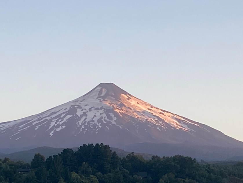 El volcán Villarrica, majestuoso e inquietante, que se levanta frente a mí, uno de los más activos de Chile y uno de los pocos que tiene un lago de lava permanente en su cráter. Los mapuches lo veneran como Rucapillán, la casa del espíritu. El sol se esconde detrás de las montañas, tiñendo el cielo de color naranja y púrpura, que se refleja en las aguas quietas del lago. El aire fresco y el aroma de la naturaleza me envuelven, mientras contemplo este paisaje vivo, salvaje y sagrado, en un silencio solo cortado por el suave susurro del viento.