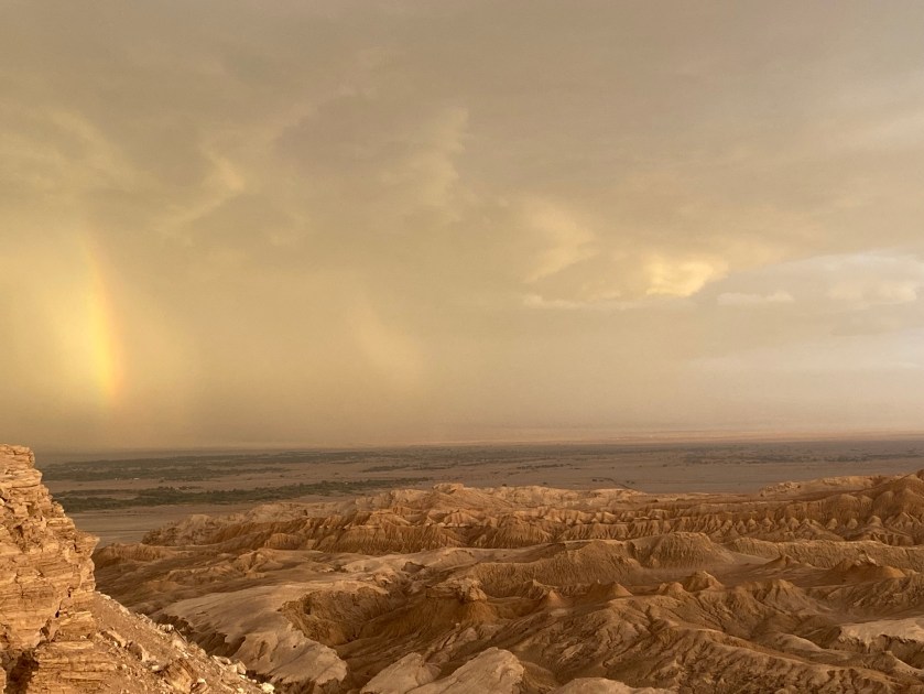 El Valle de la Luna, que despliega un paisaje de otro mundo entre las colinas afiladas de la cordillera de la Sal, con la mina de sal Victoria, las Tres Marías y la majestuosa Duna Mayor. Caminando por este escenario geológico, me siento como si pisara la superficie lunar. A medida que la tarde avanza, la cordillera de los Andes y sus volcanes se recortan en el horizonte, mientras el desierto se pinta de tonos dorados y rojos. El espectáculo se hace todavía más impresionante cuando, detrás de los Andes, una tormenta eléctrica ilumina el cielo con relámpagos que se reflejan en la aridez del paisaje. El instante culmina con la aparición inesperada de un arcoíris, un contraste sublime en medio de la inmensidad. Es un momento de pura magia, una experiencia inolvidable.