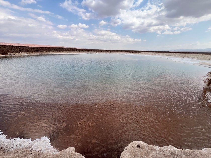 Piedras Rojas, que me regala un paisaje de ensueño, donde el rojo intenso de las rocas, producto de la oxidación del hierro, contrasta con el azul turquesa de las lagunas y el blanco inmaculado de los Andes, hoy aún más brillante después de la lluvia. El camino hasta aquí ha sido un espectáculo en sí mismo. Atravesamos la Laguna Chaxa, donde flamencos rosados se reflejan en aguas cristalinas, contemplando las lagunas Miscanti y Miñiques, rodeadas por volcanes majestuosos. A medida que descendemos hacia la laguna salada, la naturaleza despliega su paleta más vibrante, creando un escenario rebosante de energía y belleza.