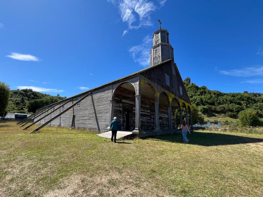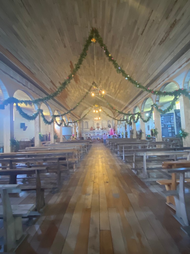 Quinchao, un pueblo tranquilo, una joya escondida entre los paisajes verdes de Chiloé, donde el alma parece respirar a un ritmo lento y sosegado. Su iglesia es un testigo vivo de la historia religiosa de la región. Está en proceso de reconstrucción, y preserva su patrimonio respetando su belleza original. En el exterior, los palos de madera que la apuntalan dan una sensación de fragilidad y fuerza a la vez, como si fuera una estructura en proceso de curación, que necesita la ayuda de la comunidad para seguir en pie. Contemplándola, siento una profunda admiración por la historia de este pueblo, como si la tierra y la propia comunidad mantuvieran viva su esencia.