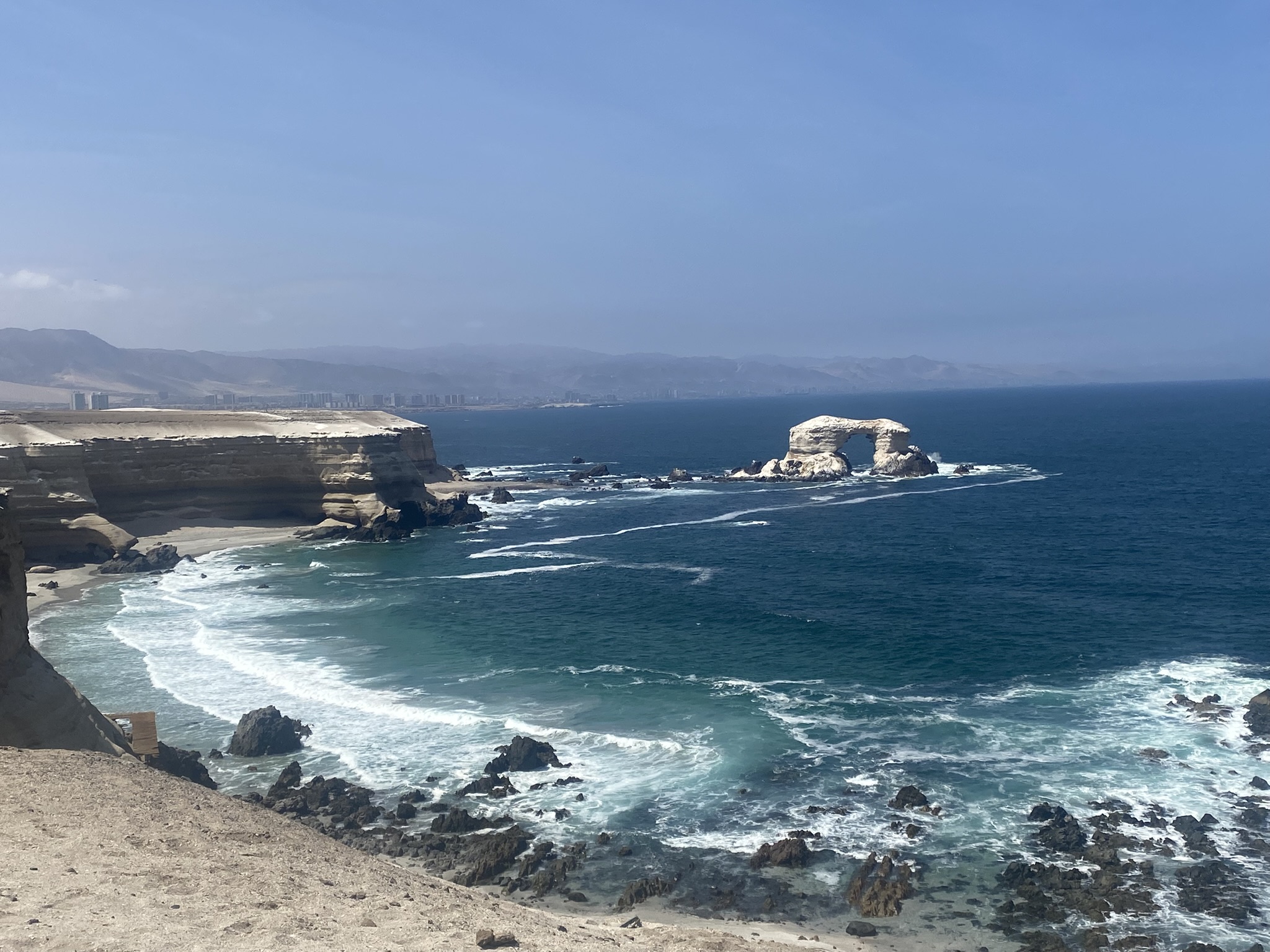 La Portada, un icónico arco de roca situado en la costa de Antofagasta, es una impresionante formación esculpida por la erosión marina a lo largo de miles de años. En sus rocas se pueden encontrar caparazones marinos fosilizados, testigo de que esta zona estuvo sumergida bajo el mar hace millones de años. La playa situada justo debajo hace unos años era accesible para el baño, pero ahora está prohibido porque la estructura rocosa se está desprendiendo de forma natural. Desde el altiplano que rodea el mirador, contemplamos el paisaje majestuoso y tomamos fotografías que capturan la belleza de este monumento natural, con el azul intenso del océano Pacífico como telón de fondo.