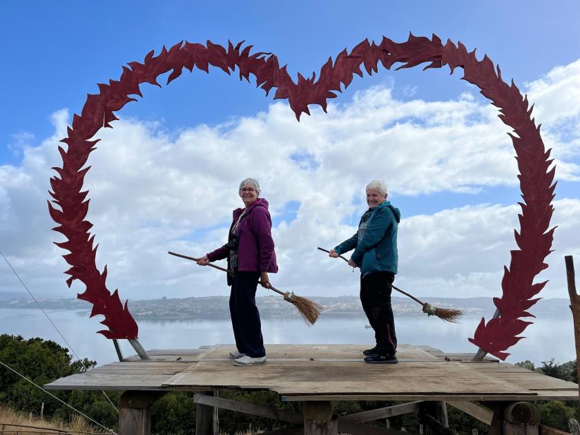 La isla Lemuy, donde me adentro en el mágico Parque del Muelle de los Brujos, un sitio repleto de leyendas sobre las brujas chilotes, que capturaban viajeros con sus caballitos de mar y los transportaban a un mundo de misterio. Me dejo llevar por el encanto del lugar, con escobas viejas y columpios con alas que parece que me invitan a un sueño. En este ambiente mágico, pienso en mi nieta y conecto profundamente con mi niña interior, ese rincón de mí que siempre ha creído en la magia.