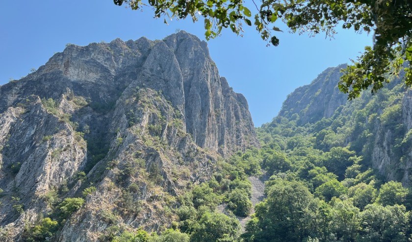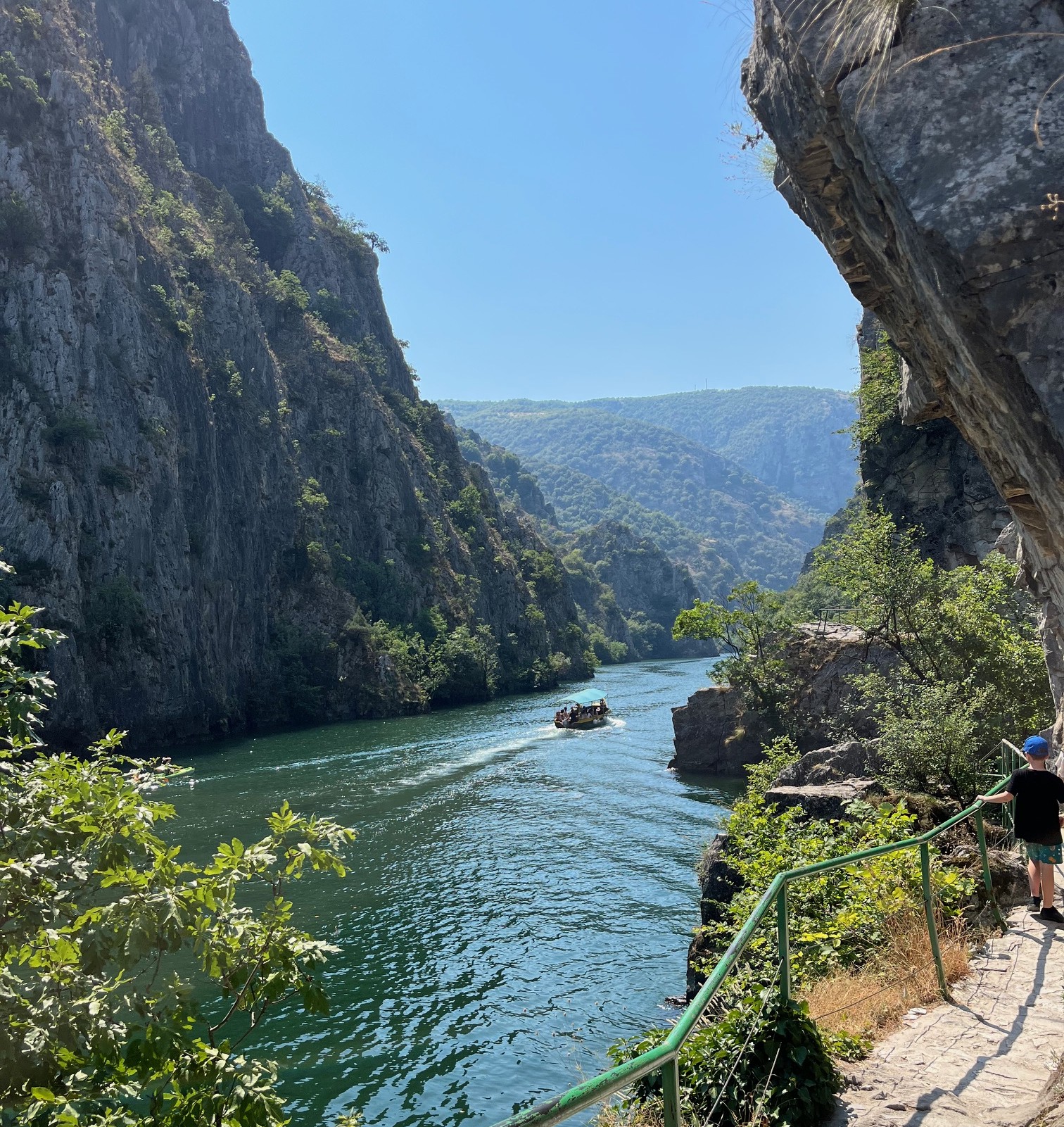 El cañón de Matka, una maravilla natural donde el río Treska, el canto de los pájaros  y el susurro de las hojas llenan el aire. Lo primero que me cautiva es el paisaje, con paredes de roca verticales que se alzan imponentes a ambos lados, cubiertas de un verde vibrante. Empezamos a caminar por un sendero estrecho que serpentea siguiendo el lago artificial, creado en 1938 con la construcción de una pequeña presa. El camino, a veces angosto, ofrece vistas espectaculares del lago Matka, que refleja las rocas y los árboles como un espejo.