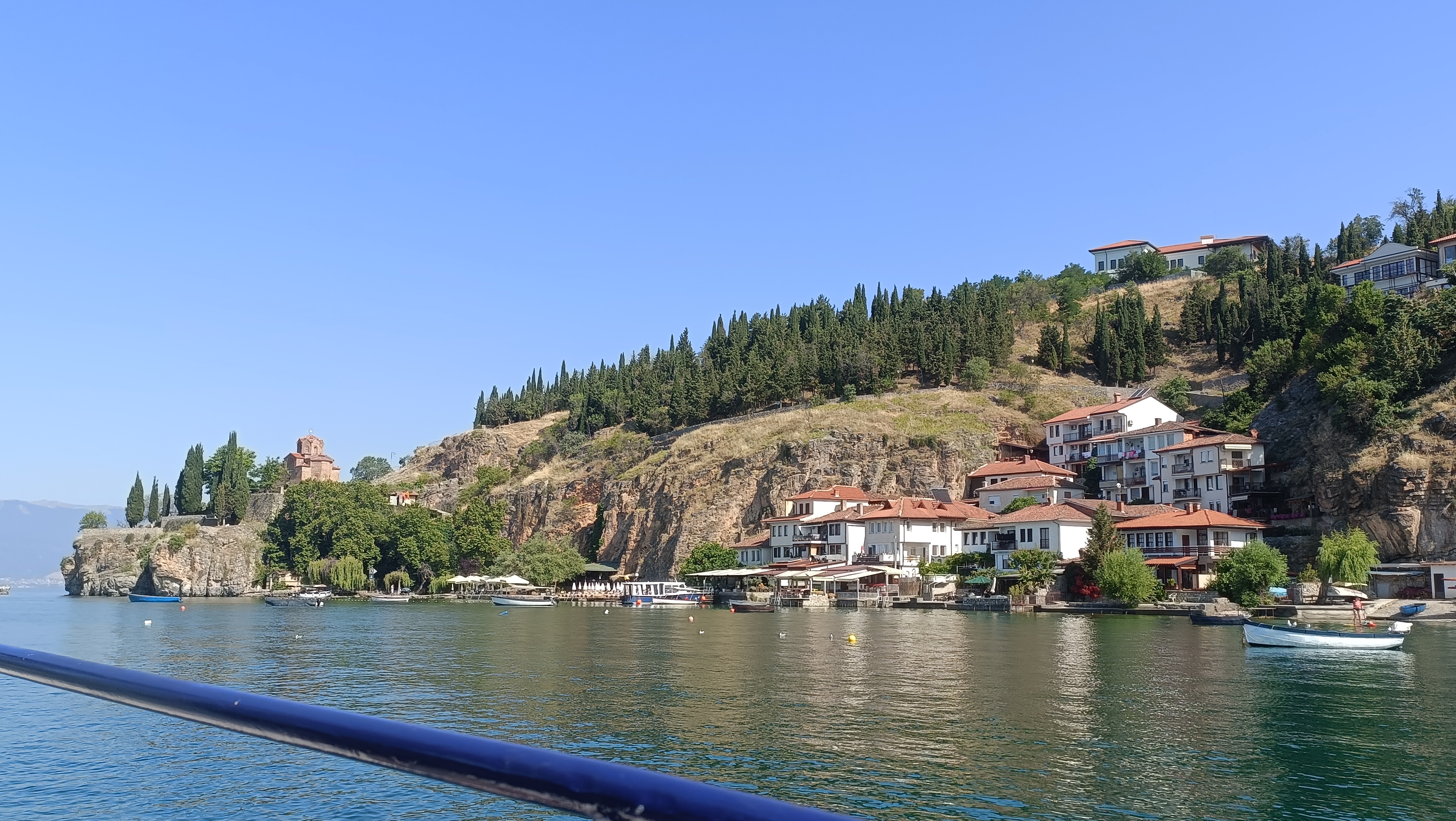 El lago Ohrid es un espacio natural para descansar la mirada y el espíritu. Sus aguas transparentes reflejan el cielo y las montañas, creando un hermoso paisaje. Cuentan que en sus orillas se alzan 365 iglesias y capillas, una para cada día del año. Hacemos un paseo en barco, navegando suavemente por sus aguas serenas hasta situarnos justo bajo la iglesia de San Juan Bautista de Kaneo. Erguida sobre un acantilado, su silueta se recorta con elegancia sobre el azul intenso del lago. como una visión suspendida entre el cielo y el agua. Me cautiva la imagen de esta pequeña joya de piedra flotando en el horizonte.