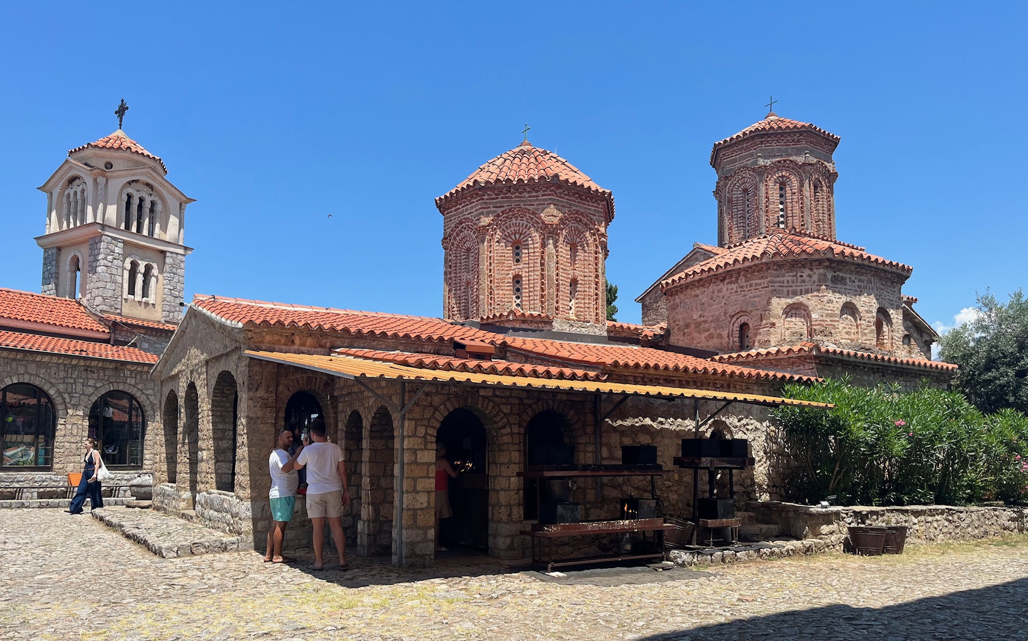 Sveti Naum, entre aguas puras y ecos sagrados. Situada al sur del lago Ohrid, cerca de la frontera con Albania, este antiguo monasterio ortodoxo macedonio destaca por su belleza y espiritualidad. Manantiales de agua transparente, que brotan de ríos subterráneos procedentes del lago Prespa, alimentan las aguas de Ohrid. El monasterio invita a la contemplación, envuelto por la figura de san Naum, monje y sanador. En su interior, los cantos monásticos resuenan, dando al lugar una atmósfera intemporal.