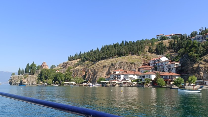 El llac Ohrid és un espai natural per descansar la mirada i l’esperit. Les seves aigües transparents reflecteixen el cel i les muntanyes, creant un bonic paisatge. Expliquen que a les seves ribes s’alcen 365 esglésies i capelles, una per a cada dia de l’any. Fem un passeig en vaixell, navegant suaument per les seves aigües serenes fins a situar-nos just sota l’església de Sant Jovan Bogoslov de Kaneo. Enfilada damunt d’un penya-segat, la seva silueta es retalla amb elegància sobre el blau intens del llac. Em captiva, la imatge d’aquesta petita joia de pedra flotant en l’horitzó.