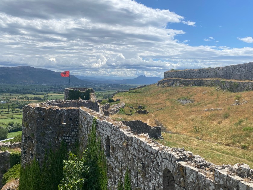 Rozafa, la fortalesa entre rius i llegendes. Una de les més grans dels Balcans Occidentals situada al cim d’un turó rocós, s’eleva imponent damunt la confluència dels rius Drin i Buna, amb el llac Shkodër brillant al fons. Construïda en època il·líria i ampliada pels romans, venecians i otomans, encara conserva  murs, restes d’estances, cisternes i fins i tot una petita capella, dins el recinte. Però el que més em commou és la llegenda tràgica que l’envolta, de la dona que va ser emparedada viva perquè els murs no caiguessin. Camino entre les ruïnes, el vent em frega la pell, i l’horitzó s’estén immens. Les pedres, carregades de segles, semblen xiuxiuejar secrets antics.