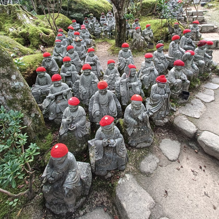 El temple budista Daisho-in, als peus de la muntanya, acull un silenci antic. Les escales serpentegen com un camí interior, a l’ombra de roques humides i arbres vells. Entre la molsa, centenars de petites figures de pedra semblen conversar en murmuris. Els seus somriures suaus i mirades serenes queden suspesos en l’aire. Els gorrets vermells, teixits a mà, els donen un batec càlid i humà, com si fossin companys de camí.