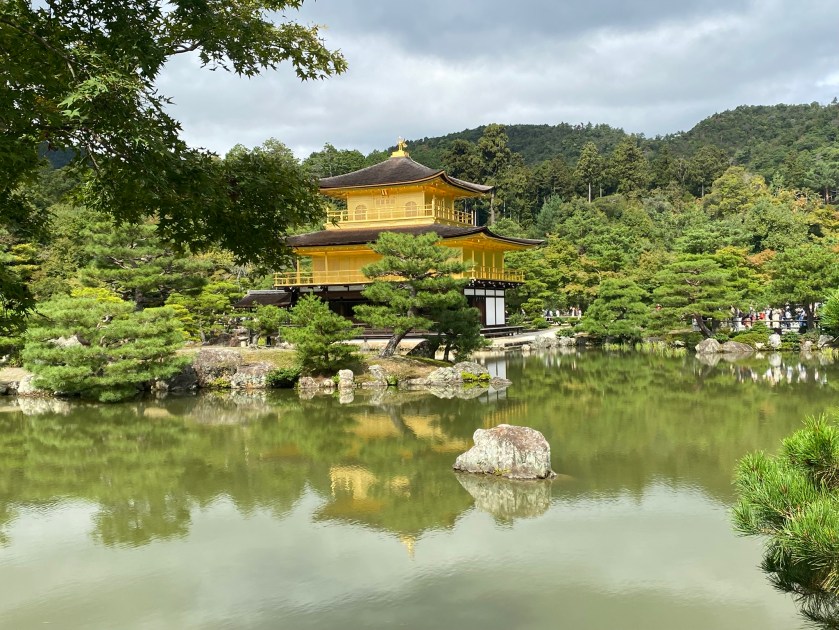 El Pavelló Daurat de Kinkakuji un temple zen que s’aixeca com un miratge entre el bosc i l’aigua. Les dues plantes superiors, recobertes de pa d’or, brillen suaument sota la llum, i el seu reflex vibra damunt l’estany. Al voltant, el jardí respira serenitat, els pins, retallats amb paciència al llarg dels anys, i les roques col·locades amb cura, composen un espai pensat per a la quietud i la contemplació.