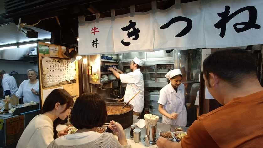 El mercat de Tsukiji on l’aire és ple d’aromes que barregen mar i fum, tradició i quotidianitat. Caminem pels carrerons de l’antic mercat, on encara es respira l’esperit d’Edo, malgrat que les subhastes de tonyina s’hagin traslladat. Davant nostre, un petit local bull d’activitat: olles fumegen, plats passen de mà en mà, i els cuiners treballen amb precisió i amb cura. La gent menja asseguda a la barra o dret al carrer, sense presses però sense pausa. Tot aquí sembla senzill i alhora intens.