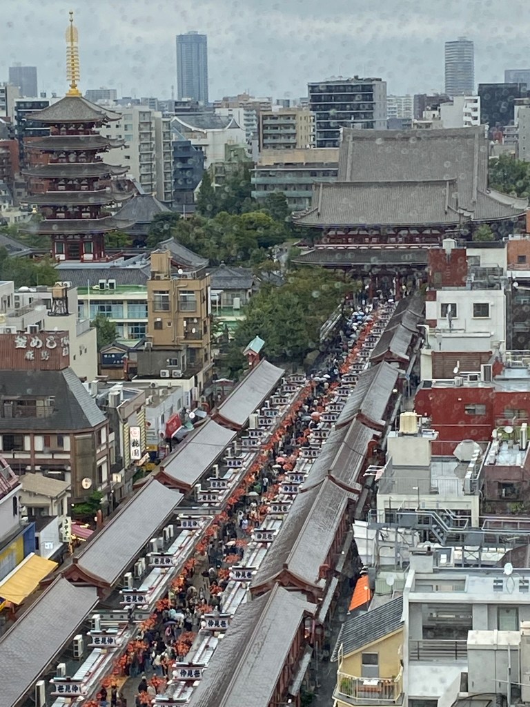 El barri d’Asakusa s’obre des de la terrassa del Centre de Cultura i Turisme com un paisatge ple de capes: teulades tradicionals, carrers estrets i, al fons, la gran pagoda que s’alça com una columna enmig de la ciutat. Al centre, un corredor de teulades vermelloses guia la mirada fins al temple Senso-ji, al qual s’accedeixper mitjà d’una porta custodiada pels déus budistes del llamp i del vent, amb un fanal gegant al mig. S’estén com un riu de paraigües i passos, a causa de la pluja que ens acompanya durant tot el matí.