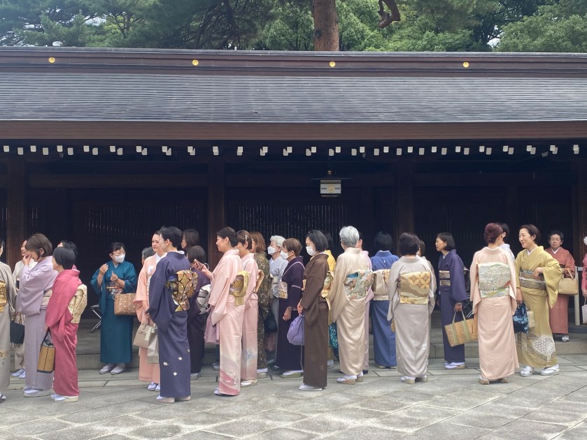 El santuari Meiji Jingu, on el gran torii anuncia l’entrada a l’espai sagrat. El camí que flueix per un bosc immens condueix fins al pati principal, on la fusta fosca i les teulades de coure donen forma a l’arquitectura sintoista. Entre la gent, destaca un grup de dones amb quimonos, cadascun amb el obi lligat amb precisió i gràcia. Parlen, riuen, i avancen juntes cap a la cerimònia. Sento que aquí la tradició es viu.