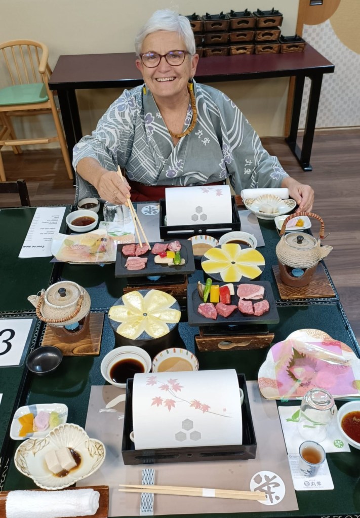 L’experiència del ryokan ha estat de calma i sorpresa des del primer moment on ens hem descalçat per accedir al silenci del tatami i ens hem vestit amb el yukata com qui adopta un altre ritme. El bany a l’onsen, lent i calent, ens ha alliberat el cos i la ment. I al sopar, la taula s’ha omplert de plats disposats amb cura. Colors suaus, textures fines, petits bocins que es cuinen al moment. Hem brindat amb sake somrients. Tot ha estat amable, com una respiració compartida.