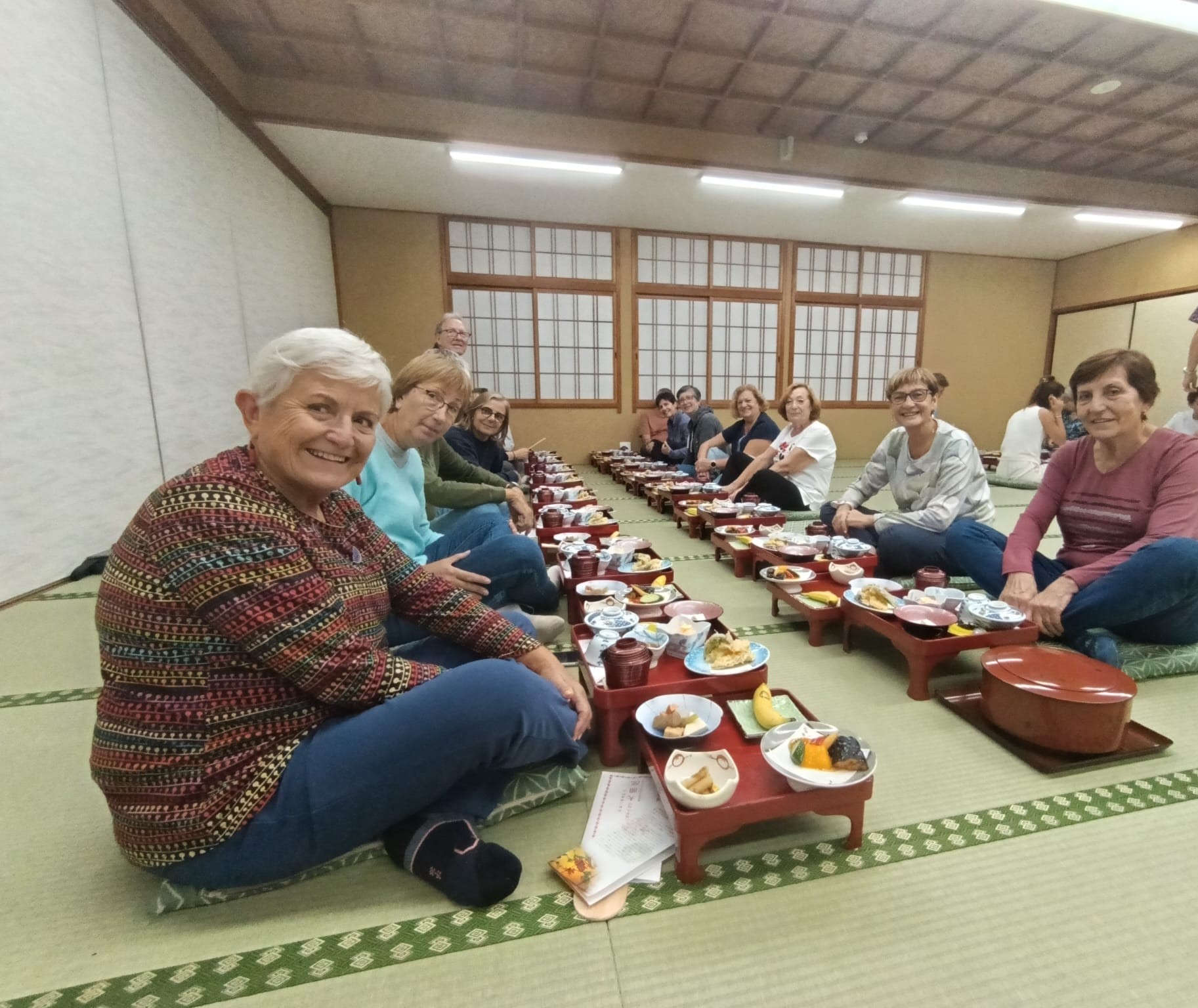 L’experiència del ryokan ha estat de calma i sorpresa des del primer moment on ens hem descalçat per accedir al silenci del tatami i ens hem vestit amb el yukata com qui adopta un altre ritme. El bany a l’onsen, lent i calent, ens ha alliberat el cos i la ment. I al sopar, la taula s’ha omplert de plats disposats amb cura. Colors suaus, textures fines, petits bocins que es cuinen al moment. Hem brindat amb sake somrients. Tot ha estat amable, com una respiració compartida.
