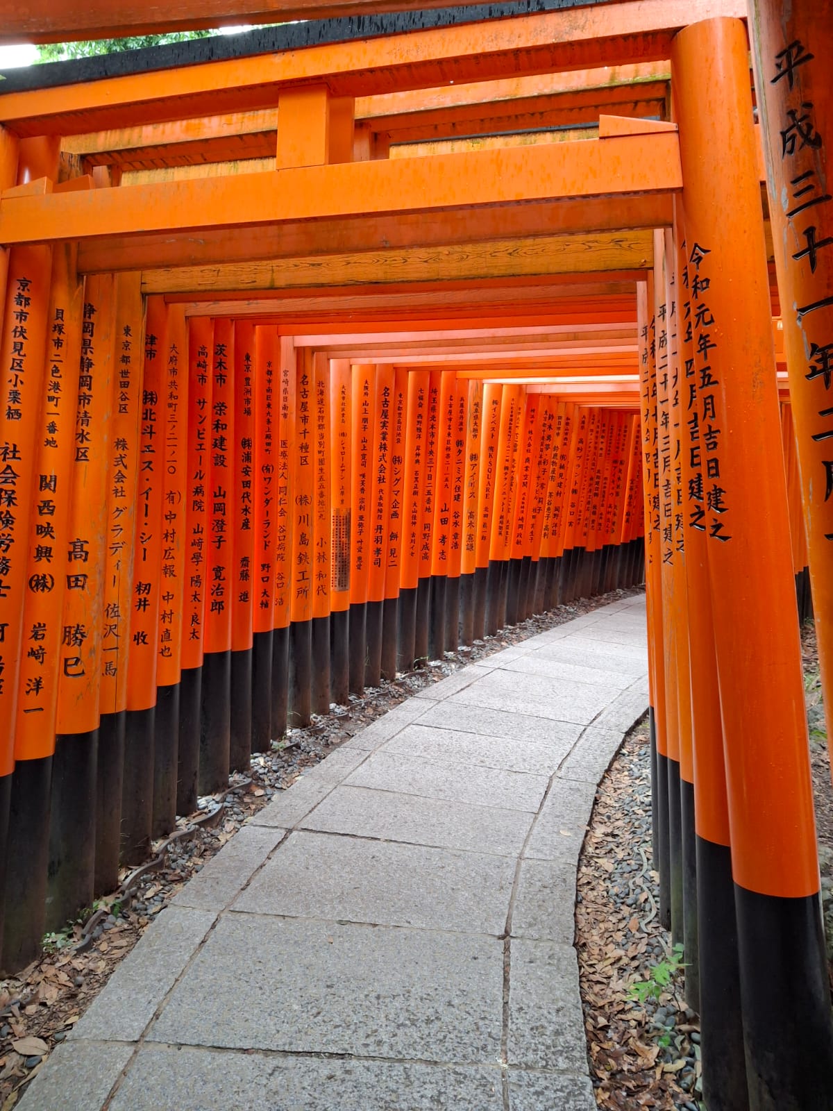 Els toriis vermells de Fushimi Inari, formen un camí viu que s’enfila muntanya amunt. Cada torii és una ofrena de famílies, comerciants i empreses que el dediquen al déu Inari, protector de les collites i de la prosperitat, gravant-hi el seu nom en senyal d’agraïment i de desig de bon auguri. Són milers, col·locats un darrere l’altre, creant un túnel vermell que sembla infinit.