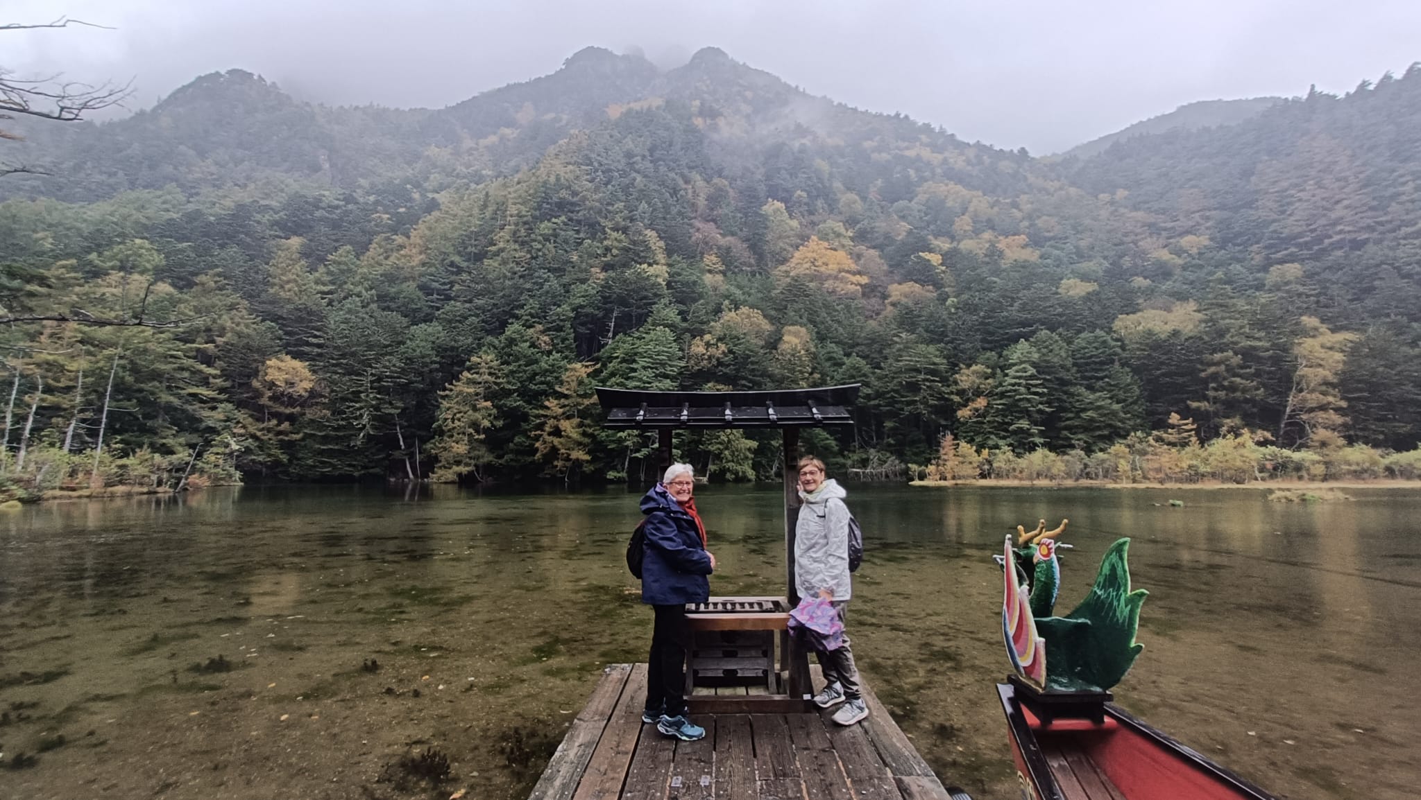 El santuari Myojin, on darrere el torii, l’altar és la natura: bosc, muntanyes i llac convertits en espai sagrat. Hem arribat caminant sota una pluja fina, travessant l’altiplà de la vall del riu Azusa, a 1.500 metres d’altitud al cor dels Alps Japonesos. Som dins el Parc Nacional Chūbu Sangaku, entre aiguamolls i rius d’aigua transparent. El camí de fusta ens permet avançar sense trencar la delicada vegetació humida. Veiem el riu lent, clar, amb peixos que ballen entre la llum i les ombres. La tardor comença a tenyir les fulles, i tot respira una calma sagrada.