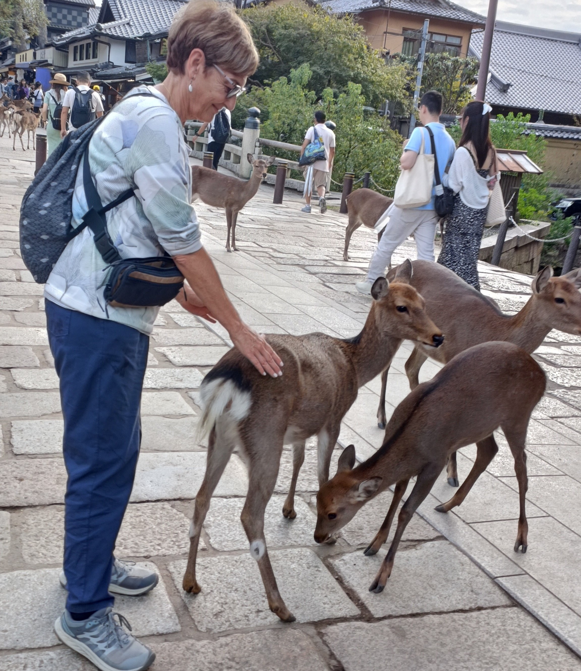 Els cérvols sika de Nara que passegen lliurement pel parc, considerats missatgers de les deïtats sintoistes. En són més de mil, mansos però encuriosits, i s’acosten si oloren menjar. L’Anna els ofereix galetes senbei i de seguida l’envolten, juganers i una mica insistent, mentre jo els observo amb respecte. El parc és part viva d’una ciutat antiga, que en temps de l’imperi va ser capital del Japó i centre del seu art i cultura. Aquí el budisme va arrelar profundament, i encara avui els temples i la natura conviuen com una sola respiració. Nara és un lloc on la història camina al costat teu, talment com els cérvols.