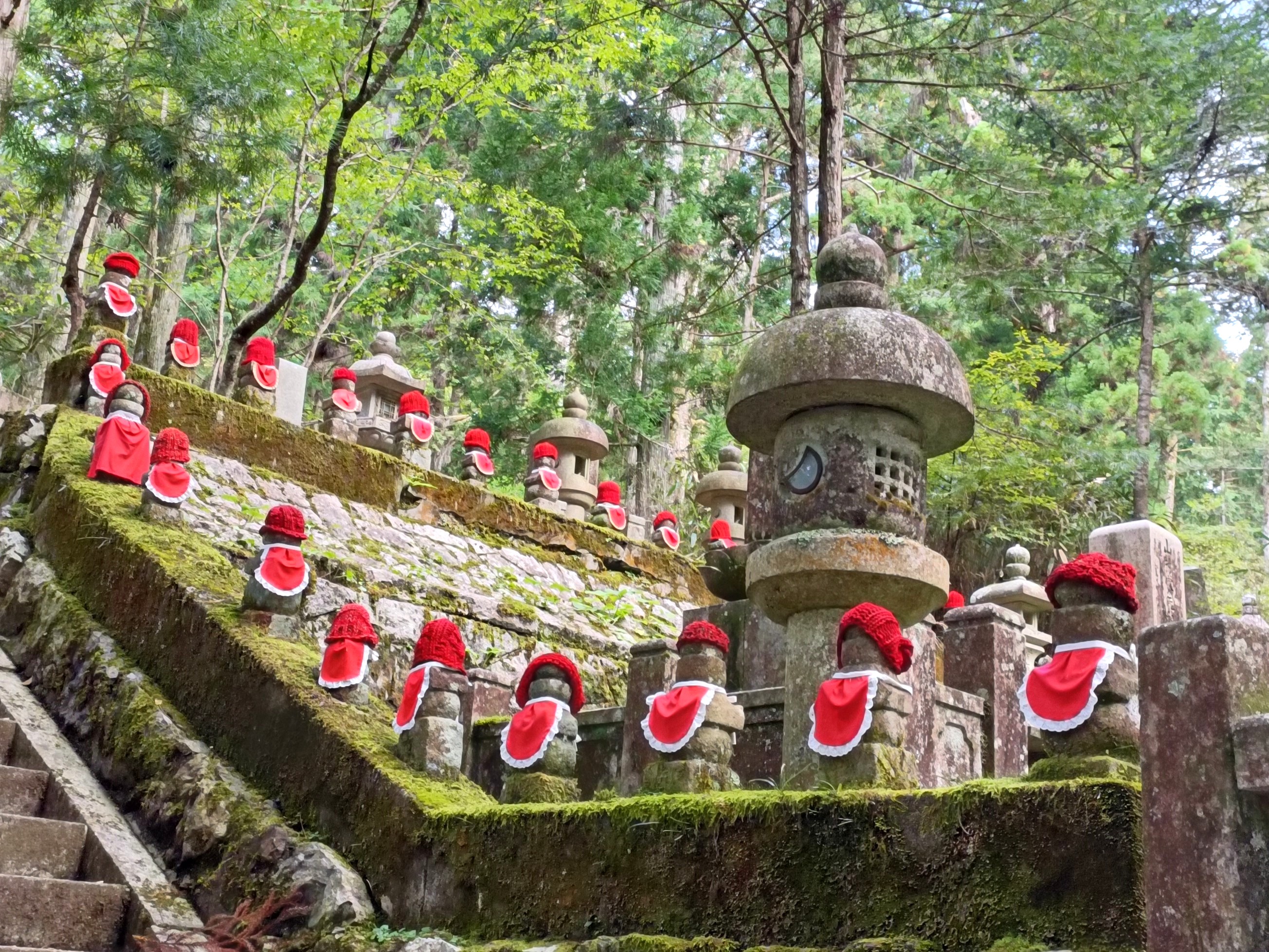 El cementiri Okunoin on caminem sota cedres centenaris que custodien més de 200.000 tombes. Entre la molsa i la pedra, les petites estàtues apareixen com guardians de tendresa. Els seus pitets vermells, deixats per famílies, són pregàries per protegir els fills en aquest món i del més enllà. El vermell destaca com una flama d’amor enmig del verd i el silenci del bosc. Arribem fins al lloc on reposa Kōbō Daishi, fundador de la comunitat de Koyasan. De nit, sota la llum suau dels fanalets, el camí esdevé commovedor.