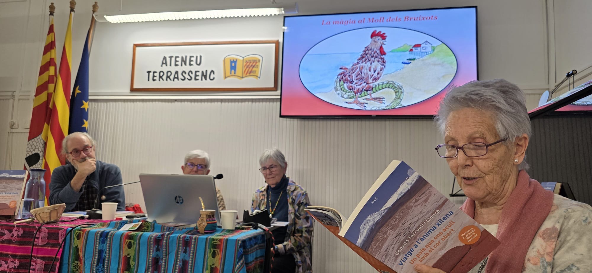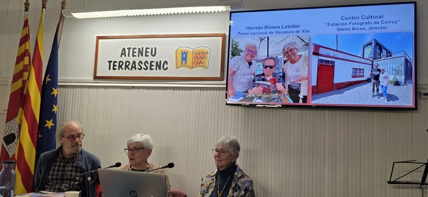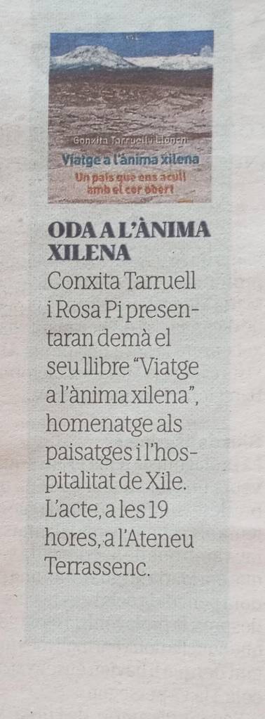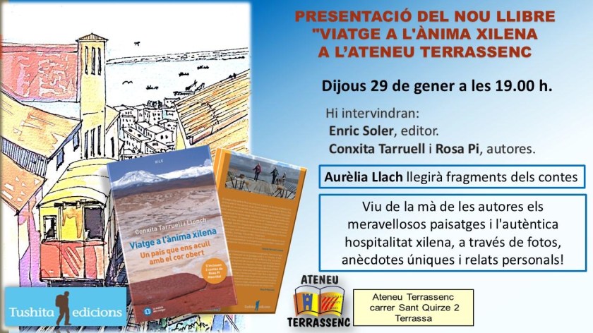 El dijous 29 de gener, la Conxita i la Rosa han presentat a l’Ateneu terrassenc l’últim llibre, Viatge a l’ànima xilena. Un país que ens acull amb el cor obert, Tushita edicions. L’acte ha començat amb la benvinguda de Mònica Bofill, membre de la Junta Directiva de l’entitat, que ha presentat les autores. A continuació, Enric Soler Raspall, editor del llibre, ha parlat del procés de creació d’aquesta obra tan especial. L’Aurèlia Llach ha captivat els assistents llegint fragments de contes que han fet volar la imaginació. Escoltar les autores és endinsar-se al cor del viatge, i al cor d’una mateixa. Elles tenen un do que màgicament connecta amb el cor de qui les escolta, transmetent una energia nova que desperta els desitjos i delers de voler viatjar. Gràcies, Conxita i Rosa, perquè escoltar-vos i veure les vostres fotos em desperten una part molt meva, íntima i viatgera, que em vincula i em fa estimar més a mi mateixa, el món i els altres. De nou, gràcies, i amb ganes de sentir-vos en properes trobades.