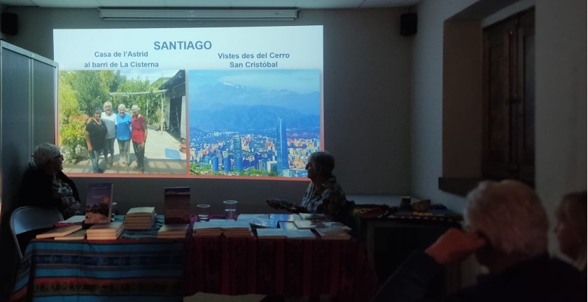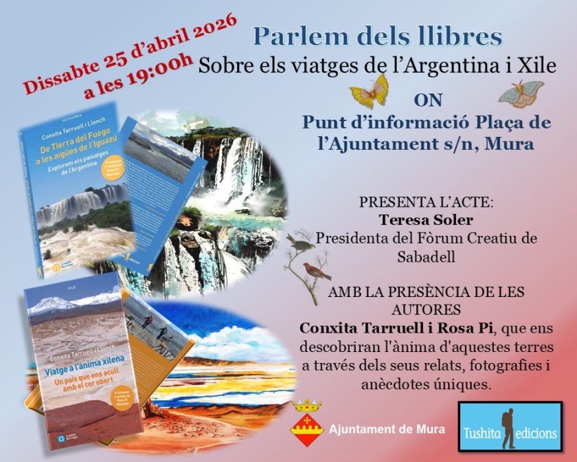 Dissabte 25 d’abril, dins dels actes de la celebració de Sant Marc a Mura, l’Ajuntament, junt amb la Teresa Puig i la Felisa Prat, va programar la presentació dels llibres de viatges a Xile i Argentina de la Conxita Tarruell, amb la participació de la Rosa Pi i amb il·lustracions dels integrants del Fòrum Creatiu de Sabadell, Agustí Bartolomé i Anna Sallés. L’acte va tenir lloc al Centre d’Informació de l’Ajuntament de Mura, on hi van assistir més de 20 persones que van omplir la sala. Es va seguir amb expectació i va despertar un gran interès entre els assistents. Va resultar entranyable la presència de dues germanes, que el seu avi havia tingut una empresa tèxtil a Xile, motiu pel qual el pare hi va néixer. Una d’elles, l’Àngels, portava el llibre Viatge a l’ànima xilena, ple d’anotacions, ja que l’havia utilitzat per fer la seva ruta pel país seguint-ne les indicacions. Tot plegat va ser d’allò més interessant. Entre una cosa i l’altra es van fer les nou del vespre, i els assistents semblava que no volien marxar. Es va crear una atmosfera càlida i una conversa molt enriquidora entre la Conxita, la Rosa i el públic. En finalitzar, la Glòria, encarregada per part de l’Ajuntament de Mura, va expressar que havia quedat gratament sorpresa per les explicacions i les imatges. Tothom en va sortir satisfet, admirat de com dues dones com la Conxita i la Rosa són capaces de dur a terme aquests viatges apassionants i d’aventura. Elles mateixes expliquen que estan obertes al món, que han conegut moltes persones que les han acollit i els han mostrat com és el seu país. De projectes no els en manquen, després d’aquesta experiència ja es preparen per emprendre un nou viatge. Així són elles, aventureres, intrèpides i bones persones. Tot un plaer conèixer-les.